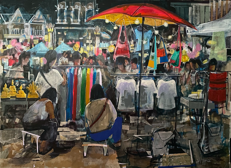 “Day Market” (Chiang Mai Gate Market) Acrylic and Paper on Canvas 35×47″ 35,000 Baht